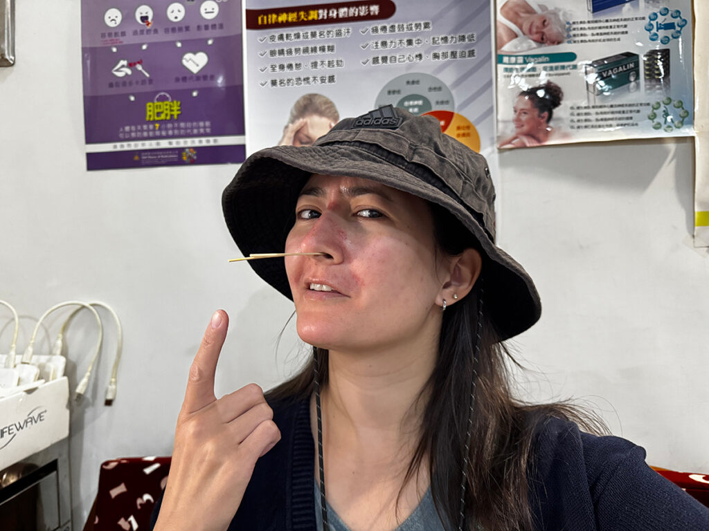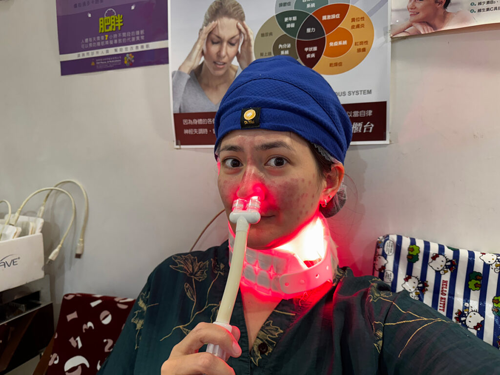 Separately from dermatology, I did red light therapy for the first time to help ease my sinus inflammation. I’m prone to sinus infections, and on one visit back to Taiwan, I was dealing with a particularly bad flare-up. During my first appointment, the doctor, a physician who emphasizes non-pharmaceutical and low-intervention treatments, stuck Q-tips up my nose until they touched the back of my throat.